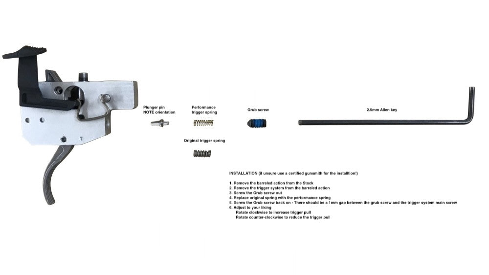 With our trigger spring you can lighten your Tikka trigger to this level, no need to get a costly replament triggers. Out of the box Tikka trigger is around ~1.2kg (~3lbs), with our kit you can tune your trigger to 0.6-0.8kg (~1.5lbs).